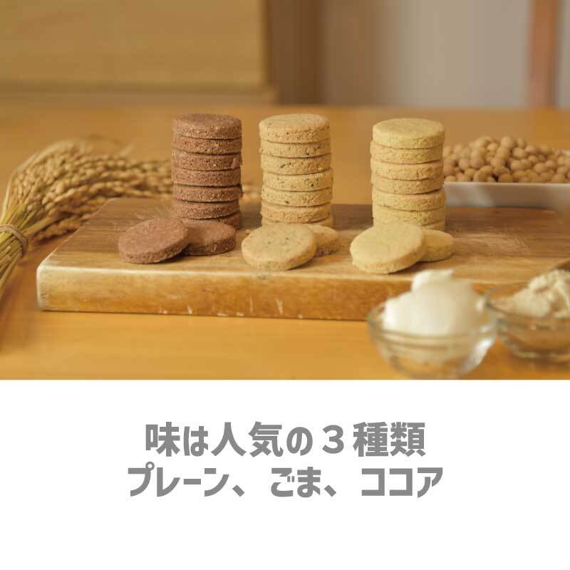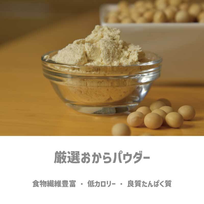 国内製造の遺伝子組み換えでないおからを厳選しました。細かいおからと、大きなサイズ違いのおからを混ぜる事でサクサクの食感を実現しました。